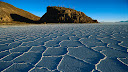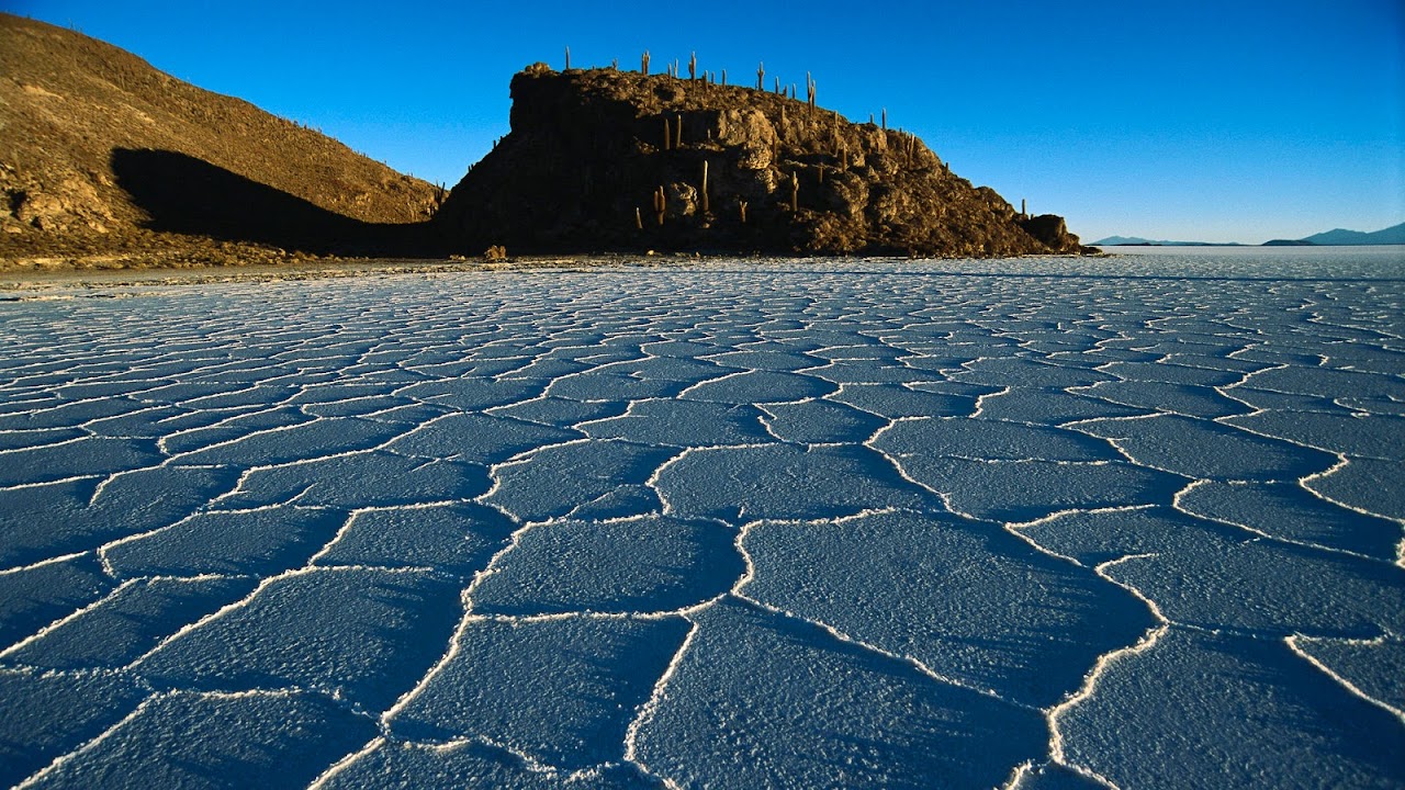 Hexagonal crystallization fissures in 100 kilometer wide, 500 kilometers thick and 12,000 year old Salar de Uyuni salt pan, altiplano, Potosi District, Bolivia